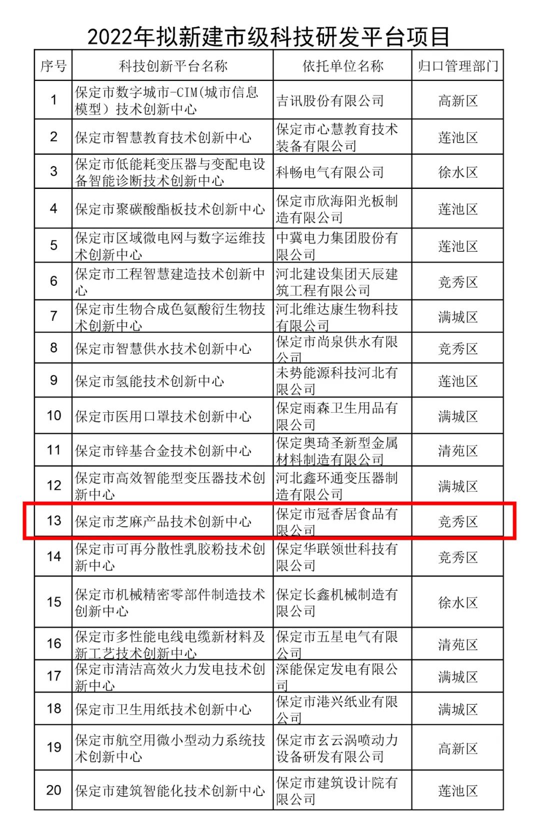 恭喜冠香居公司建立保定市芝麻產(chǎn)品技術(shù)創(chuàng )新中心
