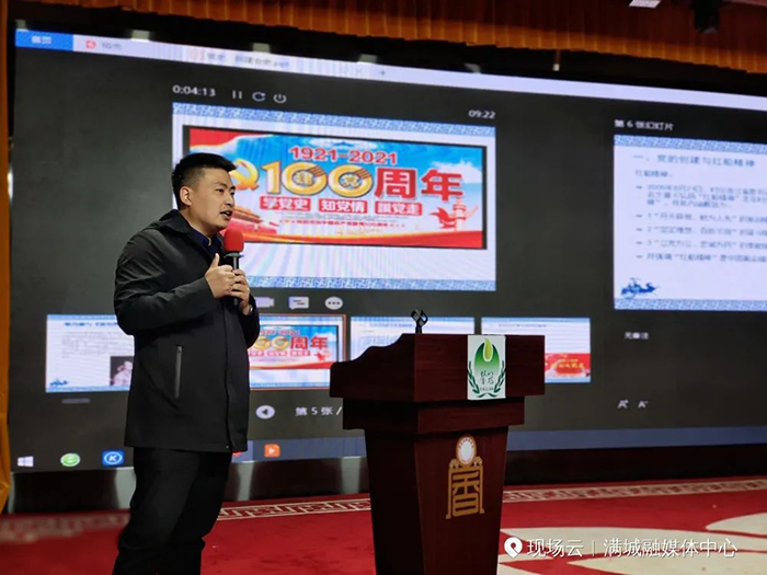 上圖為 保定市廣播電視報社黨支部書(shū)記劉賀田老師講《為什么選擇了共產(chǎn)黨》